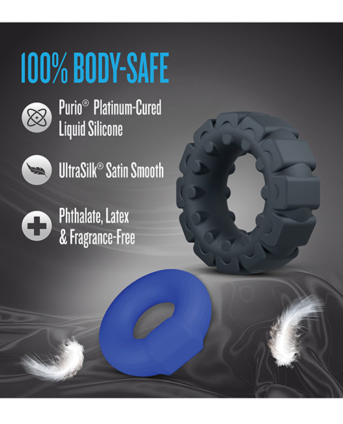 Crafted from high-quality Purio platinum-cured liquid silicone, the set includes one smooth ring for classic stamina support and one textured ring that adds stimulating friction during partner play. Each ring is ultra-soft and super stretchy, ensuring a secure fit for most sizes while the UltraSilk satin smooth finish offers a luxurious feel against the skin. Whether you prefer the simplicity of the smooth ring or the excitement of the textured option, this set elevates your experience to new heights.