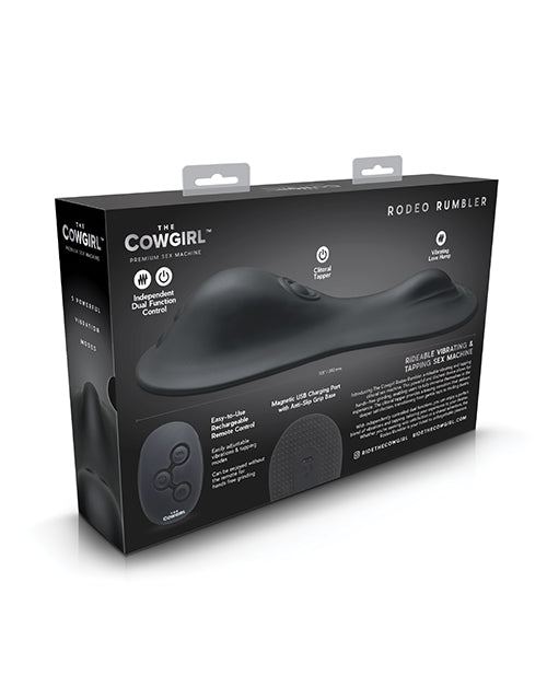 ntroducing The Cowgirl Rodeo Rumbler, a rideable vibrating and tapping clitoral sex machine. This powerful and discreet device allows for hands-free grinding, enabling users to fully immerse themselves in the experience. The clitoral tapper provides a teasing sensation that delivers deeper satisfaction, transitioning from gentle taps to thrilling bursts. With independently controlled dual functions, you can enjoy a perfect blend of vibrations and tapping, tailoring your experience to your desires. Whether you're seeking solo satisfaction or a shared adventure, the Rodeo Rumbler is your ticket to unforgettable pleasure. The Rodeo Rumbler is a rideable vibrating sex machine that offers 5 tantalizing tapping modes and 5 power vibration modes. The clitoral tapper provides a teasing sensation that delivers deeper satisfaction, transitioning from gentle taps to thrilling bursts. The Rodeo Rumbler is a portable, lightweight, flexible grinding sex machine with a remote control that offers a total hands-free experience. Offering vibration and tapping sensations, there is plenty to discover on this ride. It features a magnetic USB charging port and an anti-slip grip base for added convenience and stability. One Year Warranty.