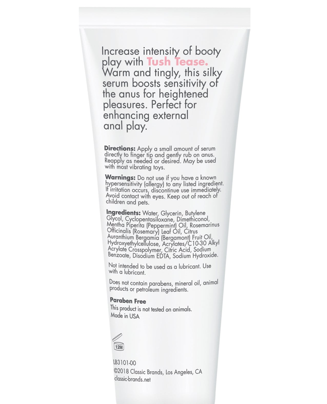 Formulated to amplify the intensity of external anal stimulation, Tush Tease is easy to apply and perfect for solo or partner play. Simply use a fingertip to apply a small amount of serum directly to the anus, and enjoy the warming effects that boost sensitivity and heighten pleasure. With a fragrance-free formula that is paraben and mineral oil-free, you can indulge worry-free, knowing this product has not been tested on animals and is compatible with most vibrating toys.