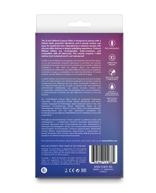 • The 5-inch Ribbed Colours Dildo is designed to please with a ribbed shaft, powerful vibrations, and a sturdy suction cup base for hands-free fun.