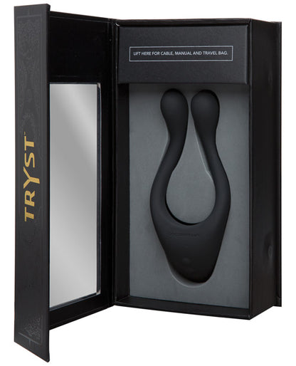 Encounter limitless pleasure. The revolutionary TRYST Multi Erogenous Zone Massager, designed with both men and women in mind, it is as versatile as your desire. TRYST is comprised of two curved vibrating arms and a vibrating base, each powered by a strong 7-function motor. Dual zone controls allow users to set individual vibration patterns for the arms and the base. Flex the arms to hug the clitoris, nipples, or glans (underside of penis) and position the base in a variety of stimulating ways! TRYST's firm but flexible vibrating arms offer a strong sensation when used on their own, while the solid base adds an intense rumbling massage as you position the arms to hug your body's most sensitive spots. The arms of TRYST are also subtly angled to provide g-spot stimulation when both or one is inserted into the vaginaβ insert one vaginally and flex the other to stimulate the clitoris or anus for multi-zone pleasure. TRYST can also be used as a C-Ring, a highly stimulating option for couples play or hands-free male masturbation! Position TRYST around the shaft of the penis with the base or arms angled toward the head of the penis to provide stimulation for both partners. Greater sensation for both partners can be achieved when TRYST is positioned against the base of the penis (behind the balls)-- this puts TRYST in a great position to stimulate the male perineum while still providing vibration for the clit and labia upon deeper penetration.