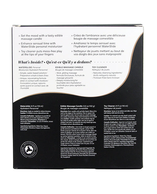 Inside this enticing set, you'll find the Waterslide Personal Moisturizer, a unique formula that hydrates and enhances your experience. With just four simple ingredients, it offers a long-lasting slick glide that is gentle on sensitive skin. Additionally, the 3-in-1 Edible Massage Oil adds a delicious twist, allowing you to indulge in sweet sensations while nourishing your partners skin.