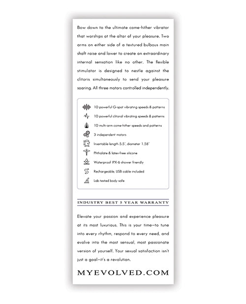 The Evolved Bow Down features a unique design with two flexible arms that raise and lower around a textured bulbous shaft, delivering extraordinary internal sensations. With independent control of all three powerful motors, you can customize your experience to perfectly suit your desires. Additionally, the cleverly designed stimulator hugs the clitoris, ensuring that every moment is filled with blissful stimulation.