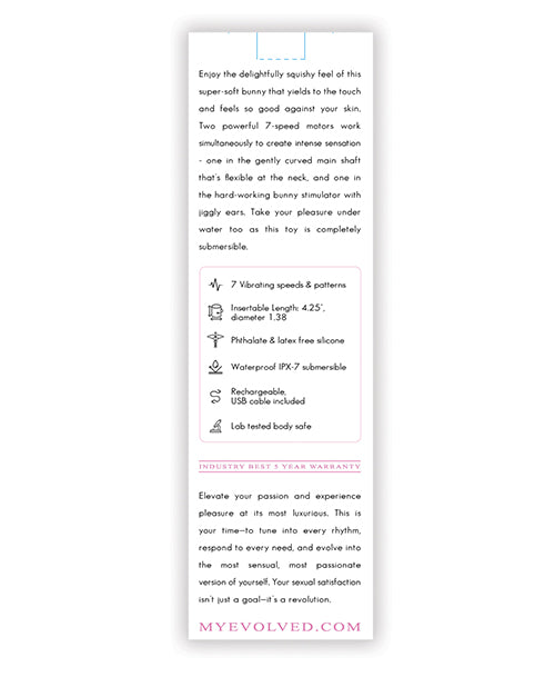 Don't miss out on the chance to elevate your pleasure experience. Grab the Evolved Cushy Bunny - Pink today and enjoy a five-year warranty that ensures your satisfaction.