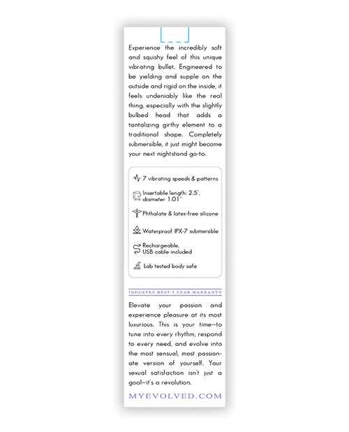 Dont wait to transform your pleasure routineexperience the Evolved Squishy Bullet - Lilac today. Elevate your intimacy and make this luxurious toy your new favorite accessory.