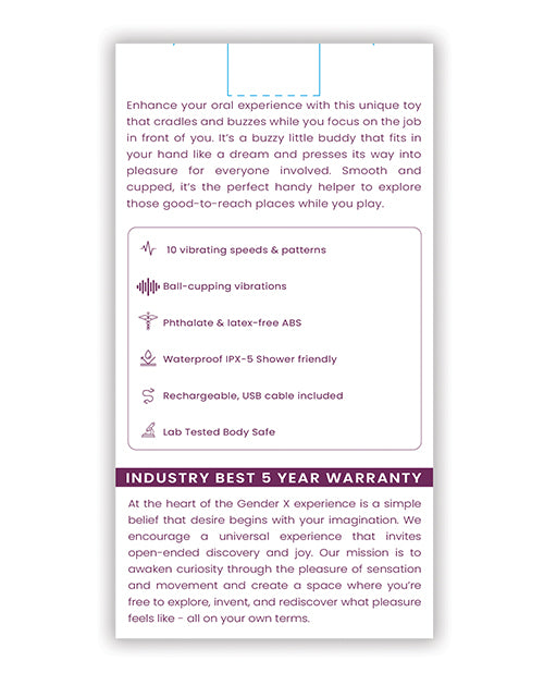 Enhance your oral experience with this unique toy that cradles and buzzes while you focus on the job in front of you. Its a buzzy little buddy that fits in your hand like a dream and presses its way into pleasure for everyone involved. Smooth and cupped, its the perfect handy helper to explore those good-to-reach places while you play. Five Year Warranty.