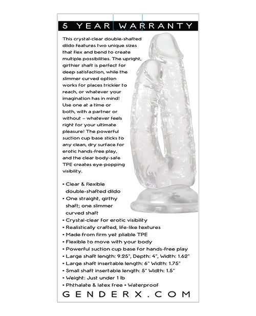 This crystal-clear double-shafted dildo features two unique sizes that flex and bend to create multiple possibilities. The upright, girthier shaft is perfect for deep satisfaction, while the slimmer curved option works for places trickier to reach, or whatever your imagination has in mind! Use one at a time or both, with a partner or without - whatever feels right for your ultimate pleasure! The powerful suction cup base sticks to any clean, dry surface for erotic hands-free play, and the clear body-safe TPE creates eye-popping visibility. Clear & flexible double-shafted dildo One straight, girthy shaft One slimmer curved shaft Crystal-clear for erotic visibility Realistically crafted, life-like textures Made from firm yet pliable TPE Flexible to move with your body Powerful suction cup base for hands-free play Large shaft length: 9.25”, Depth: 4”, Width: 1.62” Large shaft insertable length: 6” Width: 1.75” Small shaft insertable length: 5” Width: 1.5” Phthalate & latex free Waterproof Five Year Warranty