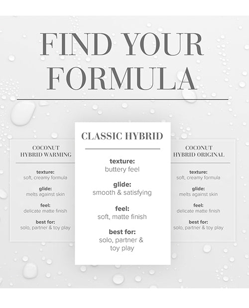 JO Coconut Hybrid lubricant is our unique blend of premium coconut oil and water-based ingredients. It offers a rich glide that melts against the skin for the perfect slide during solo, partnered, and toy play. Its soft, creamy formula absorbs naturally for a nourishing and delicate finish thats never greasy or oily. Key ingredients. Cocos Nucifera (Coconut) Oil is a natural antioxidant and moisturizer. Not compatible with polyurethane condoms.