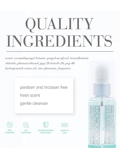 JO Misting Toy Cleaner (lightly scented) needs only one minute to clean and refresh toys. Apply to the entire surface of the toy and rinse with water 60 seconds later. The mild-yet-effective cleanser keeps toys ready for play at a moments notice. Key Ingredients. Cocamidopropyl Betaine - A surfactant that comes from coconut oil. This allows the foam to easily get rid of hard to clean oils and is known for being gentle on skin. Benzalkonium Chloride - A disinfectant or antiseptic that is often used in cosmetics as well as other daily cleaners and has a long reputation of safety.