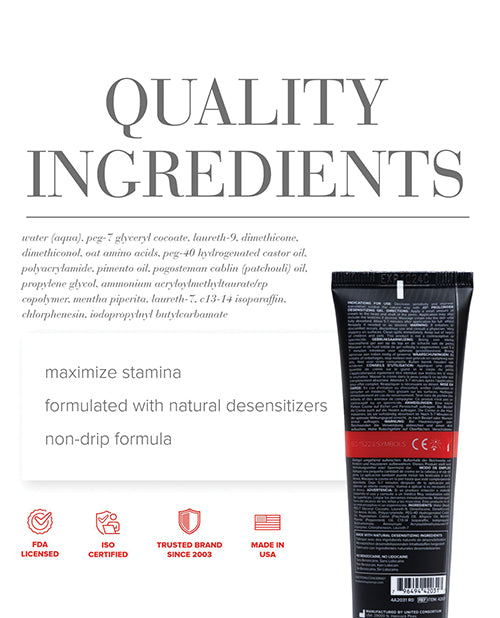 JO Prolonger Gel helps you maximize stamina for extended pleasure and playful intimacy. Specially formulated with natural desensitizers like allspice, patchouli oil, and peppermint, it's the perfect way to last longer and climax together. Compatible with toys and all most condoms. Not compatible with polyurethane condoms. Key Ingredients. Allspice Oil is well known for its anesthetic property. Provides a natural numbing effect. Patchouli Oil, is an oil that promotes healthy skin and can provide a natural numbing sensation. Mentha Piperita not only provides a cooling sensation on contact, it also provides a subtle plumping effect to skin.