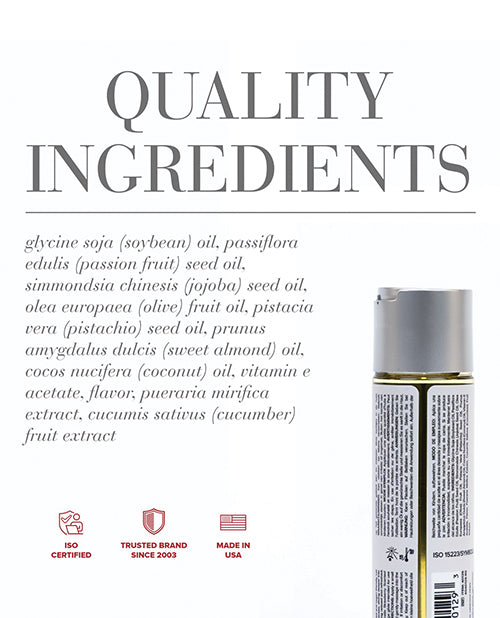 The 4 oz bottle features a unique combination of skin-friendly oils, including Jojoba and Sweet Almond, that effortlessly hydrate and protect your skin while providing a silky-smooth glide for massage. With its kissable, vegan-friendly formula, this oil is perfect for enhancing foreplay and creating an inviting atmosphere. Please note that it is formulated for external use only and is not tested for use with condoms, so take care to enjoy responsibly.