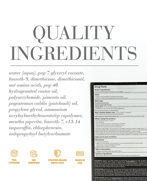 JO Prolonger Lidocaine features a precise metered sprayer that ensures consistent dosage with every application, providing a reliable experience every time. With an active ingredient concentration of 10% Lidocaine, this FDA-regulated spray works to gradually numb sensation, giving you an estimated duration of 30-45 minutes of extended enjoyment. It's important to note that this product is not compatible with polyisoprene condoms, so be sure to consider your options.