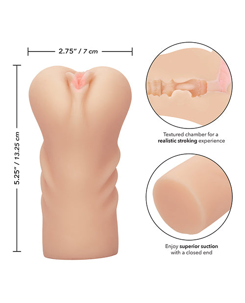 Crafted with a super tight stroke sleeve and an intricately textured chamber, this masturbator offers a life-like sensation that will keep you coming back for more. The intact hymen design enhances the feeling of authenticity, while the closed-end structure creates exquisite suction for an intensified experience. Made from ultra-soft, stretchy Pure Skin material, this compact 5.25-inch device is not only travel-friendly but also phthalate-free and unscented, ensuring safe and enjoyable use.