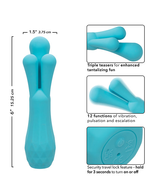 Discover unparalleled pleasure with the Gia Triple Teaser, a masterpiece designed to elevate your intimate moments. This vibrator features 3 distinct teasers, each crafted to provide maximum stimulation and enjoyment. Whether you're exploring alone or with a partner, its 12 thrilling functions of vibration, pulsation, and escalation promise a unique experience tailored to your desires. Crafted from body-safe Silicone, the stimulator is easy to use and comfortable to maneuver. Its 100% waterproof design with an IPX7 rating ensures that it can be enjoyed in the bath, shower, or any wet environment, adding versatility to your pleasure pursuits. The sleek, smooth texture enhances the sensations, making every touch more exciting. Convenience is key with this state-of-the-art massager. A sophisticated memory chip remembers your last used setting, allowing you to resume the fun right where you left off. Additionally, the security travel lock feature ensures that your Triple Teaser remains discreetly inactive during travel - simply hold the button for 3 seconds to lock or unlock. The Gia Triple Teaser is USB rechargeable, including a charging cord that completes the charge in just 1.25 hours. Whether you opt for the robust 40 minutes of high-speed action or a prolonged 55 minutes on a gentler setting, this toy adapts to your pace and preference, ensuring that no session is cut short before reaching the peak of pleasure.