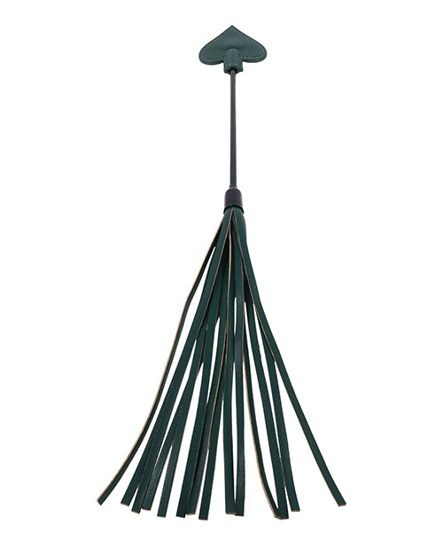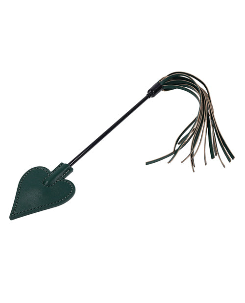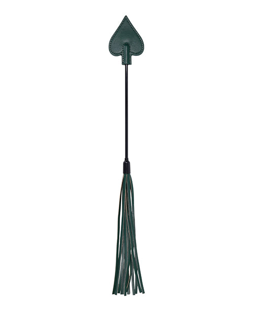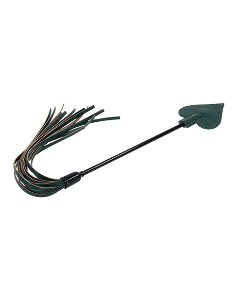 Crafted with a firm spade tip for crisp slaps and adorned with faux leather falls for a tantalizing sting, this crop offers two distinct sensations in one sleek design. Its striking emerald green color paired with elegant gold detailing adds a touch of luxury, transforming each use into a special occasion. Whether you prefer gentle teasing or a more intense experience, the Indica Dual Impact Crop adapts to your desires.