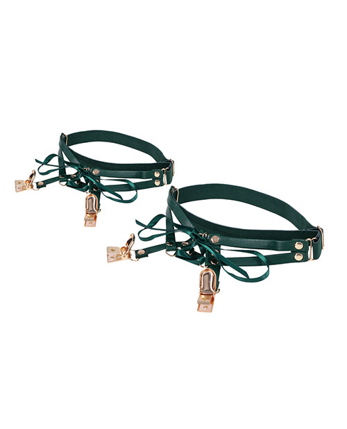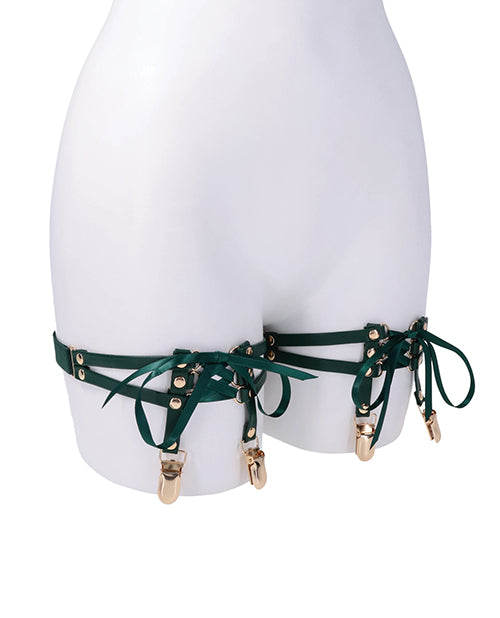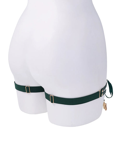 Crafted from striking emerald faux leather, the Indica Laced Up Garters feature a stylish corset-inspired design that wraps around your thighs. The silky green satin laces not only add a luxurious touch but also allow for a customizable fit, adjustable between 18 to 26 inches (45.7 to 66 cm). These garters hug your curves perfectly, ensuring that your stockings stay securely in place while making a bold statement.