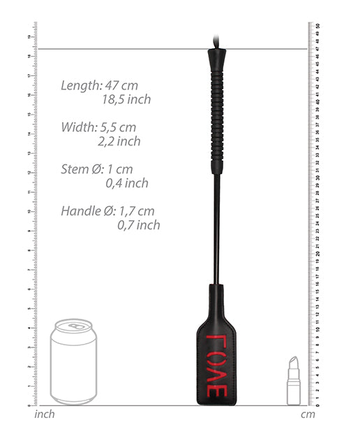 Crafted from high-quality faux leather, the crop measures 18.5 inches in length, with a 2.2-inch width that ensures a bold impact. The cleverly designed handle, measuring 0.7 inches, provides a comfortable grip, allowing for precise control during your playful encounters. The unique reversed "LOVE" imprint guarantees a memorable reminder of your connection, making every strike a blend of pleasure and discipline.