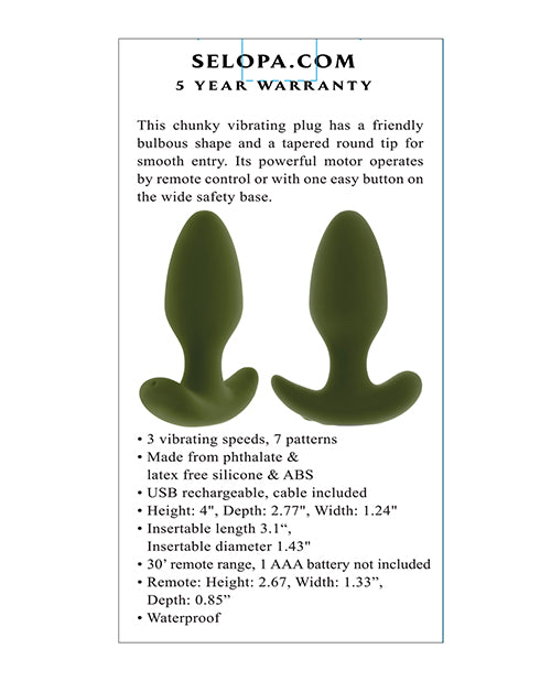 Experience unparalleled pleasure with Selopa The Colonel - Green, the perfect addition to your intimate moments. This chunky vibrating plug delivers tantalizing sensations, elevating your satisfaction to new heights.