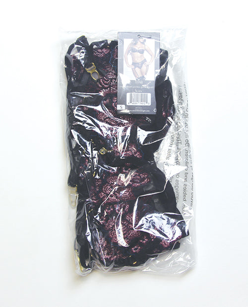 Floral Lace and Mesh Underwire Bra w/Garter & Thong 3 pc Set - Black/Purple 1X/2X