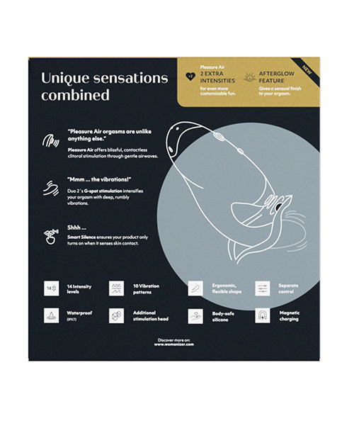 Experience unparalleled pleasure with the Womanizer Duo 2 in sleek black, your ultimate companion for extraordinary blended orgasms. This premium rabbit toy combines innovative Pleasure Air clitoral stimulation with powerful G-Spot vibrations, ensuring an unforgettable experience that redefines satisfaction.