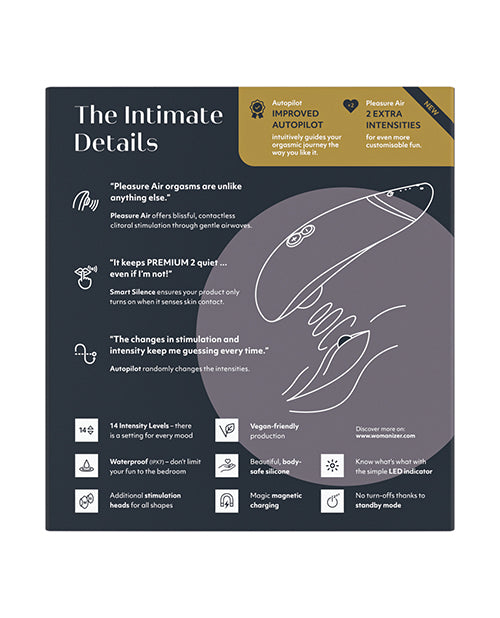 • Womanizer PREMIUM 2 with the original Pleasure Air technology is our most luxurious creation yet truly the Prada of sex toys, the ultimate toy for women who are looking for more than just another device to play with.