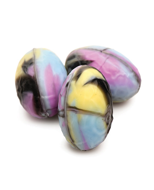 Crafted from premium, phthalate-free silicone, this dildo features a mesmerizing blend of pastel blue, yellow, pink, and black hues. Its unique texture, complete with whorls, ridges, grooves, and spikes, promises to deliver unparalleled sensations. The hollow center accommodates three silicone eggs that can smoothly slip through, enhancing your experience and allowing for immersive play. With a wide, flanged base, this toy is harness-compatible, making it versatile for all your sci-fi and fantasy roleplay adventures.