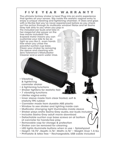 The unique features of this product include a realistic vaginal entry that opens up to a vibrating and tightening chamber, delivering an experience like no other. With its multicolor window, you can immerse yourself in the action while enjoying Sasha Greys sultry voice through the included earbuds. The adjustable 6-speed motor allows you to customize the intensity to your liking, making every encounter truly personal and tailored to your desires.