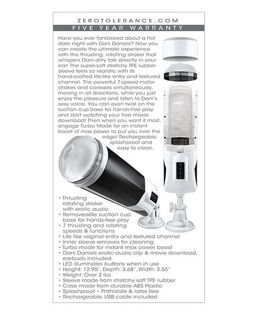 Have you ever fantasized about a hot date night with Dani Daniels? Now you can create the ultimate experience with this thrusting, rotating stroker that whispers Dani dirty talk directly in your ear! The super-soft stretchy TPE rubber sleeve feels so realistic with its hand-crafted life-like entry and textured channel. The powerful 7-speed motor strokes and caresses simultaneously, moving in all directions, while you just enjoy the pleasure and listen to Dani's sexy voice. You can even twist on the suction cup base for hands-free play and start watching your free movie download! Then when you want it most, engage Turbo Mode for an instant boost of max power to put you over the edge! Rechargeable, splashproof and easy to clean.