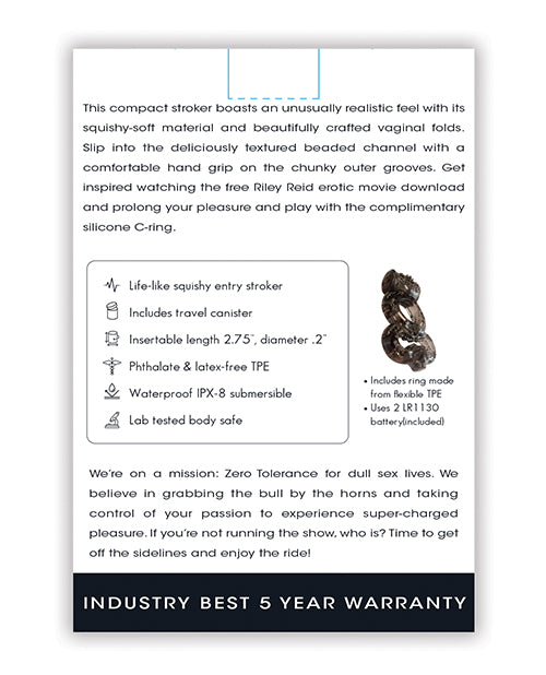Crafted from squishy-soft material, this compact stroker features beautifully designed vaginal folds for an incredibly realistic feel. The textured beaded channel enhances stimulation, while the comfortable hand grip on the chunky outer grooves ensures ease of use. Plus, indulge in the included complimentary TPE C-ring to prolong your pleasure, and don't forget to enjoy the free Riley Reid erotic movie download that comes with it. With a five-year warranty, your satisfaction is guaranteed.