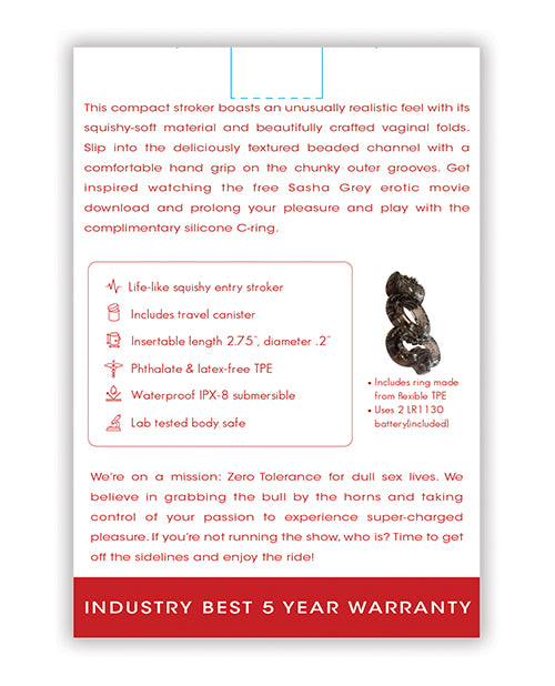 Crafted from squishy-soft material, this compact stroker mimics a remarkably realistic sensation with intricately designed vaginal folds. The beaded channel offers delicious texture, while the chunky outer grooves provide a secure and comfortable grip. Additionally, enjoy the complimentary TPE C-ring to enhance your experience, and feel reassured with a five-year warranty backing the quality of your purchase.
